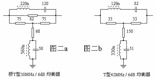 图二b是42MHz/6dB插片式固定均衡器电原理图,它采用了“T”型电路,调整L1、L2可使42MHz谐振点损耗低于0.6dB,均衡误差优于±0.4dB。